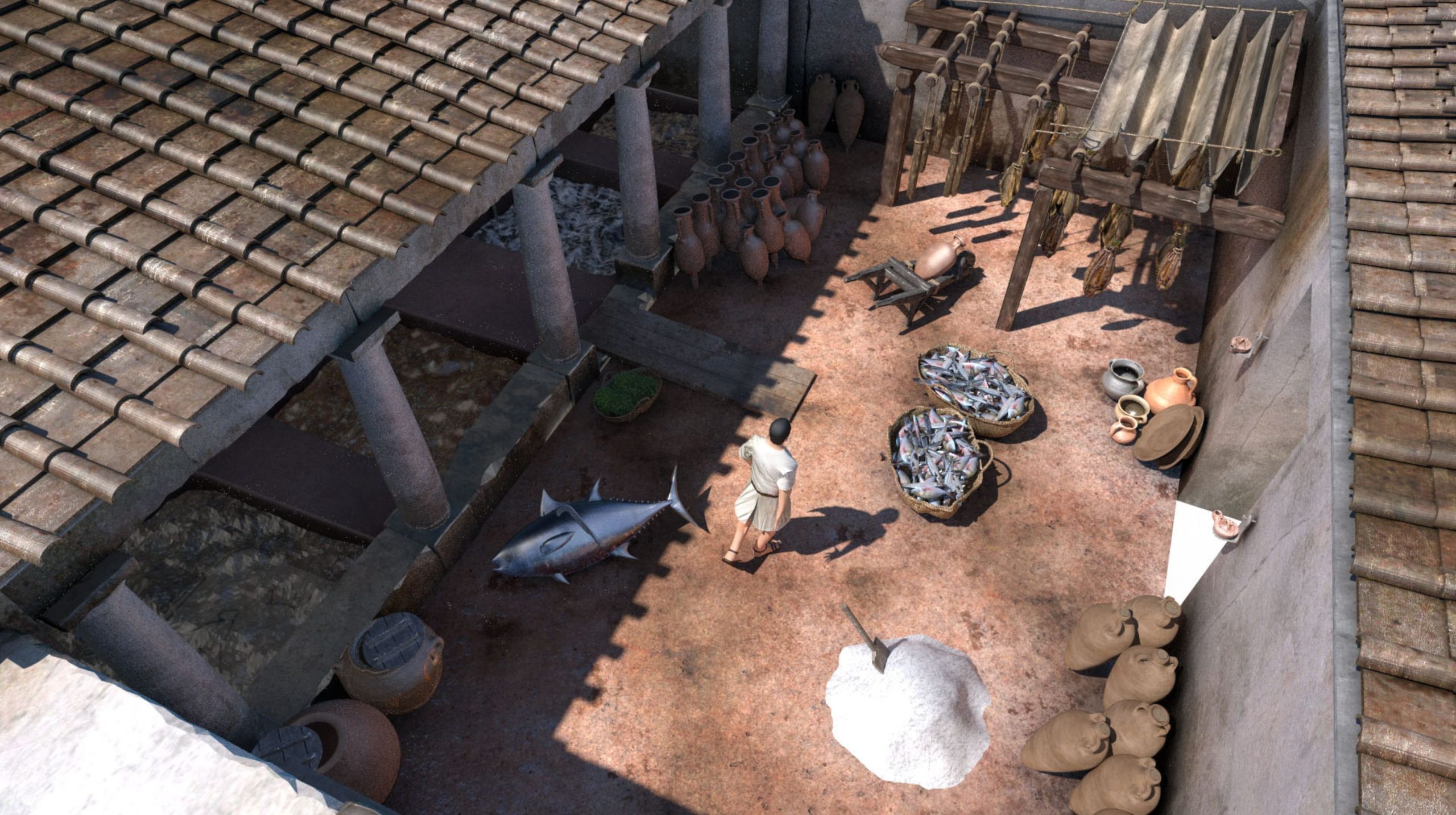 Situado noroeste de la urbe, este espacio contaba, en efecto, con un área doméstica y residencial (una domus de la que conocemos varias estancias organizadas en torno a un patio), una industrial (una factoría de salazones y conservas), e incluso una comercial una taberna [tienda] o pescadería para la venta a pie de calle). Este complejo estuvo en uso hasta comienzos del siglo III (parte productiva) y mediados del IV (área doméstica, renovada en su arquitectura en el III), abandonándose por entonces.